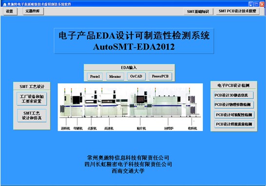經過5個月研討,四川長虹精密電子科技有限公司與常州奧施特公司合作開發(fā) “電子產品EDA設計的可制造性檢測系統AutoSMT-VisualDFM 2012”, 解決了電子SMT設計和制造“自動化孤島”的矛盾,可進行EDA設計可制造性可視化檢測, 使設計師了解SMT制造過程, 取代傳統的試機過程,縮短開發(fā)周期、降低成本、提高生產效率。該系統主要功能如下: