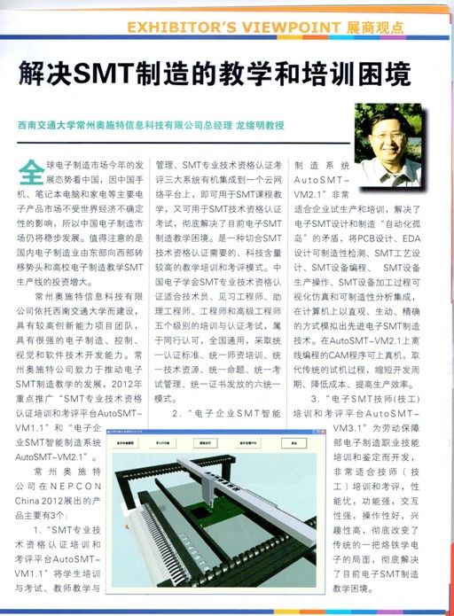 EMChina專業(yè)期刊跟蹤報(bào)到了常州奧施特公司的產(chǎn)品!半娮SMT智能制造系統(tǒng)AutoSMT VM2.1”。在四川長(zhǎng)虹精密電子科技有限公司與常州奧施特公司合作開發(fā) 的“電子產(chǎn)品EDA設(shè)計(jì)的可制造性檢測(cè)系統(tǒng)AutoSMT-VisualDFM 2012” 基礎(chǔ)上開發(fā)出來,將PCB設(shè)計(jì)、SMT生產(chǎn)線工藝設(shè)計(jì)、關(guān)健SMT設(shè)備編程、加工過程可視化仿真和可制造性評(píng)價(jià)系統(tǒng)集成,在計(jì)算機(jī)上以直觀、生動(dòng)、精確的方式模擬出先進(jìn)電子SMT制造技術(shù)。解決了電子SMT設(shè)計(jì)和制造“自動(dòng)化孤島”的矛盾,使設(shè)計(jì)師了解SMT制造過程,取代傳統(tǒng)的試機(jī)過程,縮短開發(fā)周期、降低成本、提高生產(chǎn)效率。