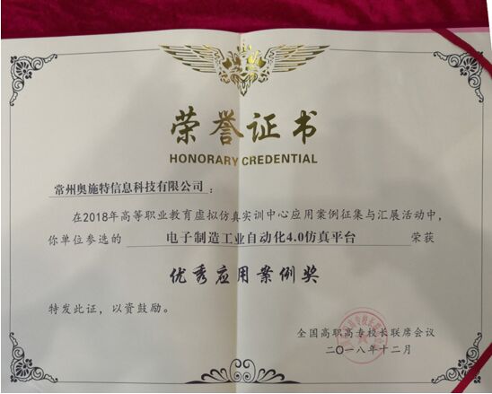 全國高職高專校長聯(lián)席會議年會上進(jìn)行了第二屆全國職業(yè)教育虛擬仿真案例評選,常州奧施特公司的產(chǎn)品“電子制造工業(yè)自動化4.0仿真平臺”獲優(yōu)秀應(yīng)用案例獎。
