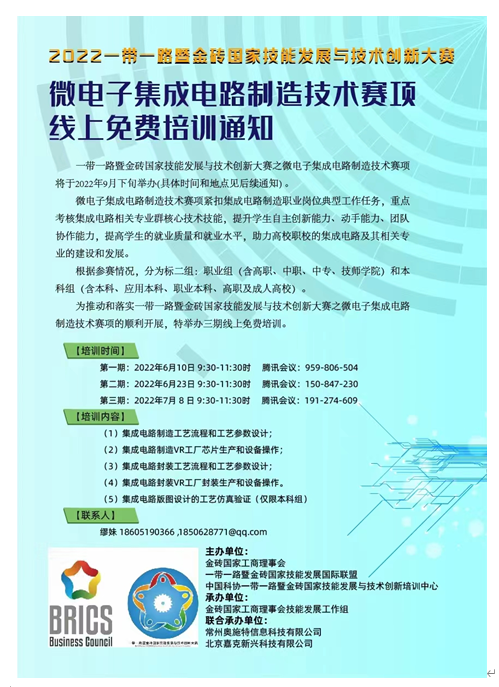 2022610日、623日、78 ,成功舉辦了2022一帶一路技術(shù)創(chuàng)新大賽微電子集成電路制造技術(shù)賽項(xiàng)線上免費(fèi)培訓(xùn)。